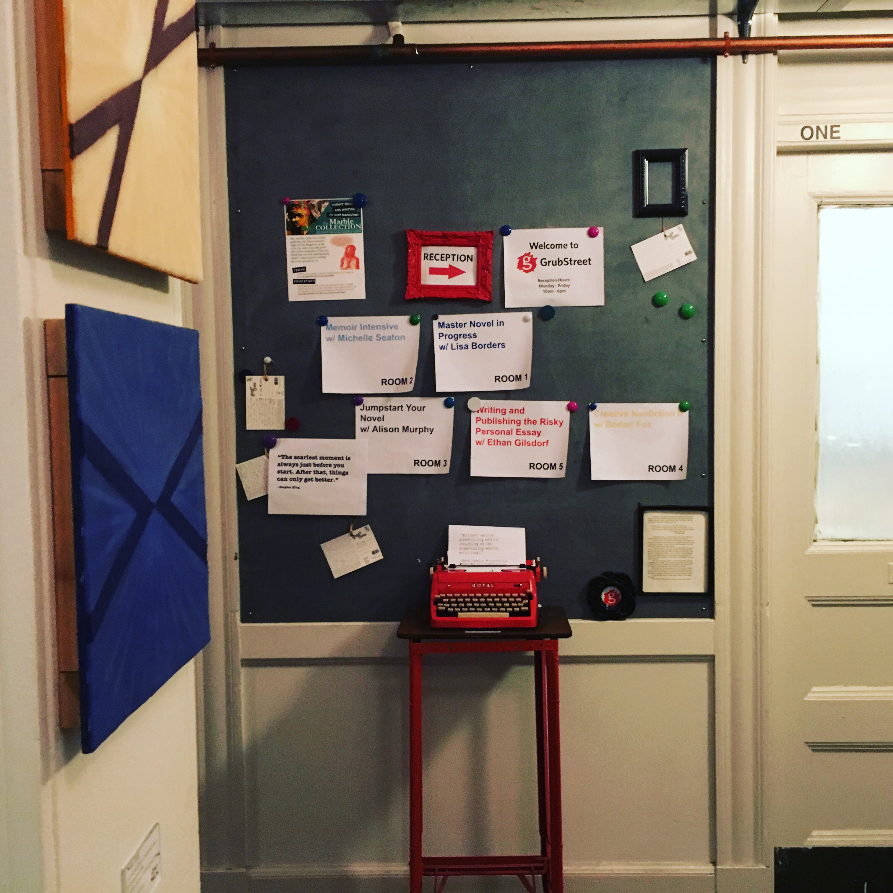 GrubStreet is a little literary oasis on the 5th floor of an historical building overlooking the Boston Common (where Smash Mouth played a public concert during one of my classes – good or bad sign? Time will tell.) Students pass through a stately entrance adjoining a piano store and wait for the old, tiny elevator, which is the only way to get up to the 5th floor organization. Limited access via closet-like transportation: yes, GrubStreet is Narnia. The elevator doors open, and straight ahead is bulletin board of class locations posted above a cheerful cherry-colored typewriter on a stand.