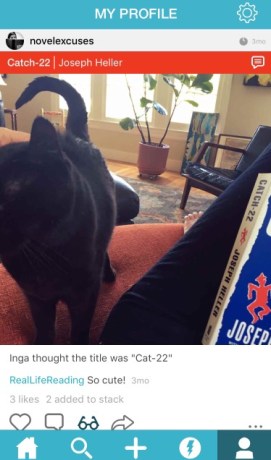 Litsy is streamlined and easy to figure out how to use. Downsides? Mainly, you may not find many friends already using it, since it hasn’t really taken off yet. But that is all the more reason you should join. Come find me (novelexcuses). Or, if you’re still not sold, read Book Riot‘s breakdown of app features (and then come find me). I’ll be the one not working on my novel, because PICTURES OF CATS AND BOOKS, GUYS!